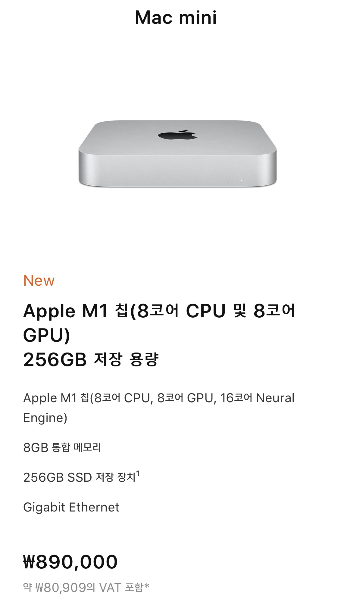 제가 구매한 모델은 맥미니 M1 기본모델 입니다. 공식홈페이지에서 구매했고 공식홈에도 옵션은 SSD 용량 차이로 256GB, 512GB만 선택이 가능합니다. 이외 램이나 추가 용량 업데이트는 CTO로 들어가서 별도 주문제작기간을 거쳐서 기존보다 배송이 보통 2~3주 더 걸린다고 보시면 될것 같습니다.