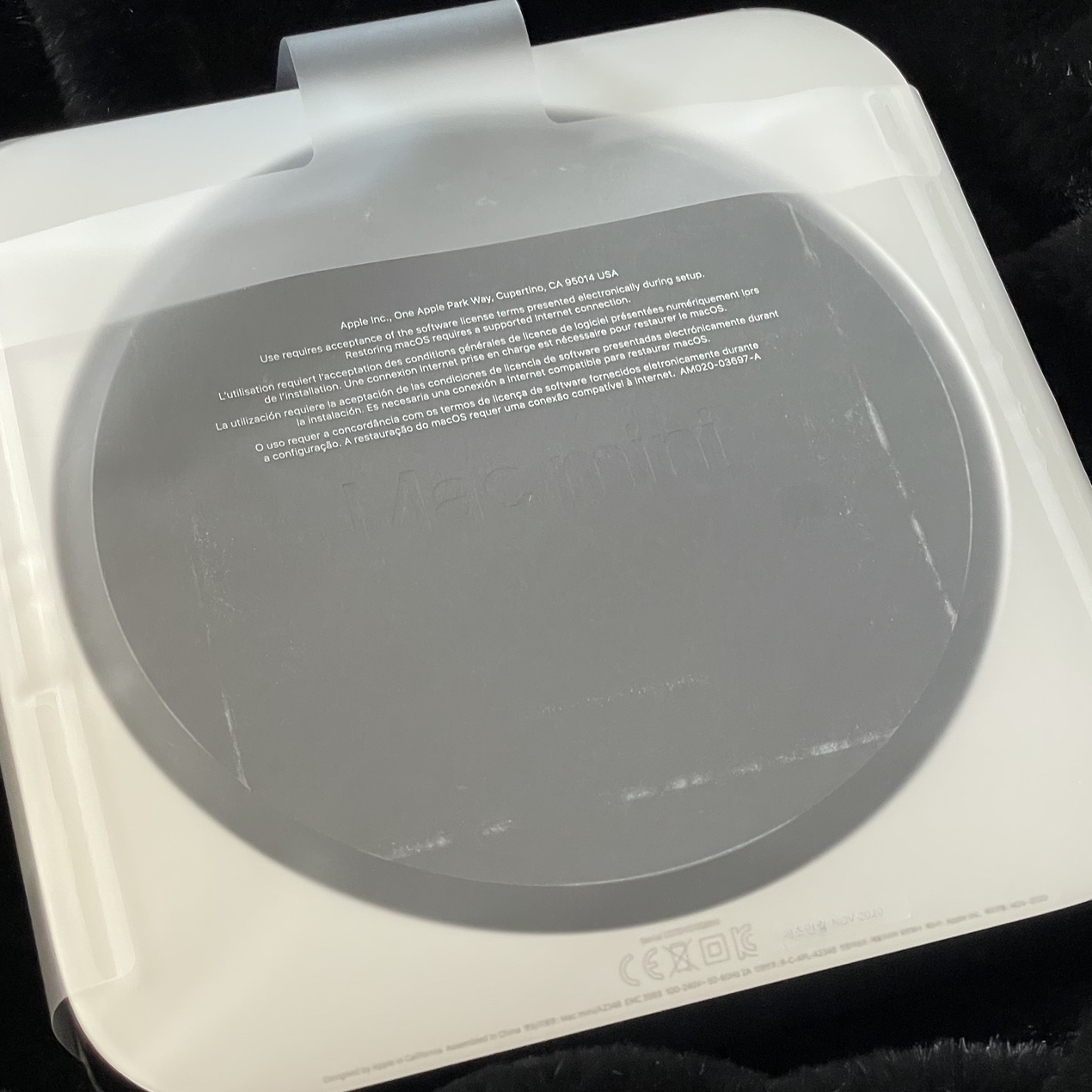 본체는 보호필름으로 한 번 쌓여져있는데 이렇게 때어내면 하단에 맥미니 로고가 들어납니다! 정사각형에 저렇게 원형으로 실버와 블랙조화가 멋스럽습니다. 소재가 주는 느낌부터 음각으로 새겨진 로고가 인덕션을 닮은듯 하면서 갬성!! 이다!! 라고 보여주네요. 사실 이부분은 실 사용하면서 볼일이 없기때문에 사진이라도 많이 봐줄려구요 ㅎ