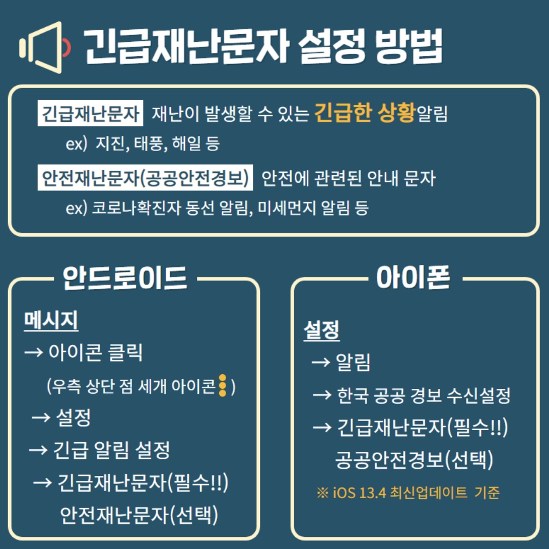 먼저 "긴급재난문자"는 정말로 긴급한 재난을 알리는 문자로써 지진, 태풍, 해일 등 자연재해로 인한 위급사항을 알리는 목적이 큽니다. 따라서 이 문자는 우리 안전=생명에 지장을 줄 수 있는 큰 재난적 요인이 발생했을때 안내되는 문자입니다. 그만큼 빈번하게 발생하는 상황은 아니지만 위급상황시 꼭 필요하니 항상 켜두시는걸 추천드립니다.