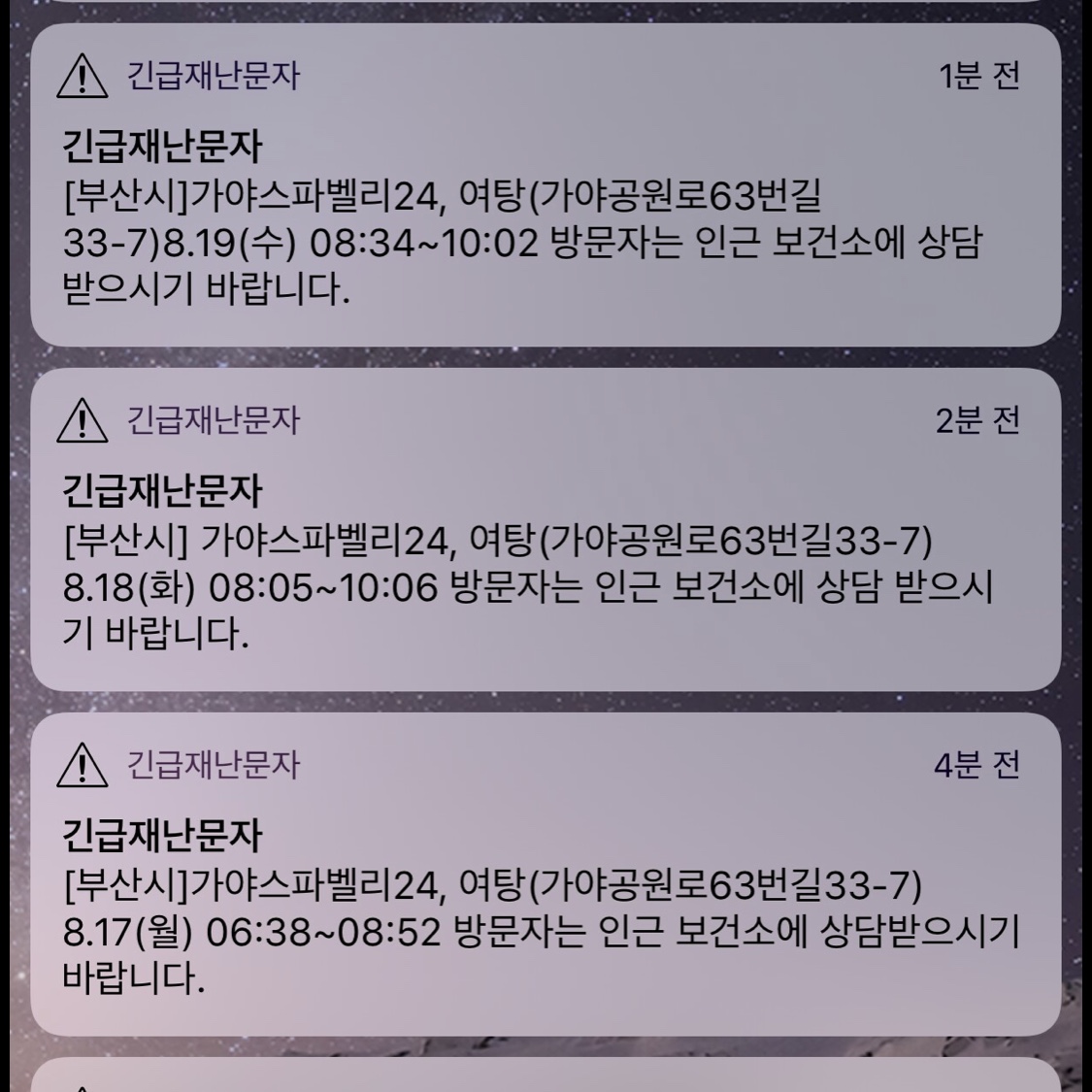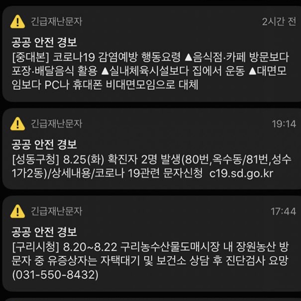 그리고 "공공 안전 경보" 의 경우는 안전에 관한 안내 문자입니다. 물론 이 경우도 빈번하게 오는 문자는 아니지만 이번 코로나 사태로 인하여 정말 빈번하게 울리게되었죠. 요즘경우에는 주로 바이러스 보유 확진자의 이동동선을 알거나, 감염여부 진단 독려 등으로도 사용되고, 날씨 요인으로 인한 미세먼지 농도가 높을 경우 등에도 사용되는 문자입니다.