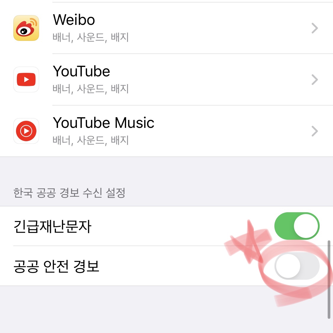 아이폰에서 긴급재난문자와 공공 안전 경보 알림 구분 끄기 설정 안내