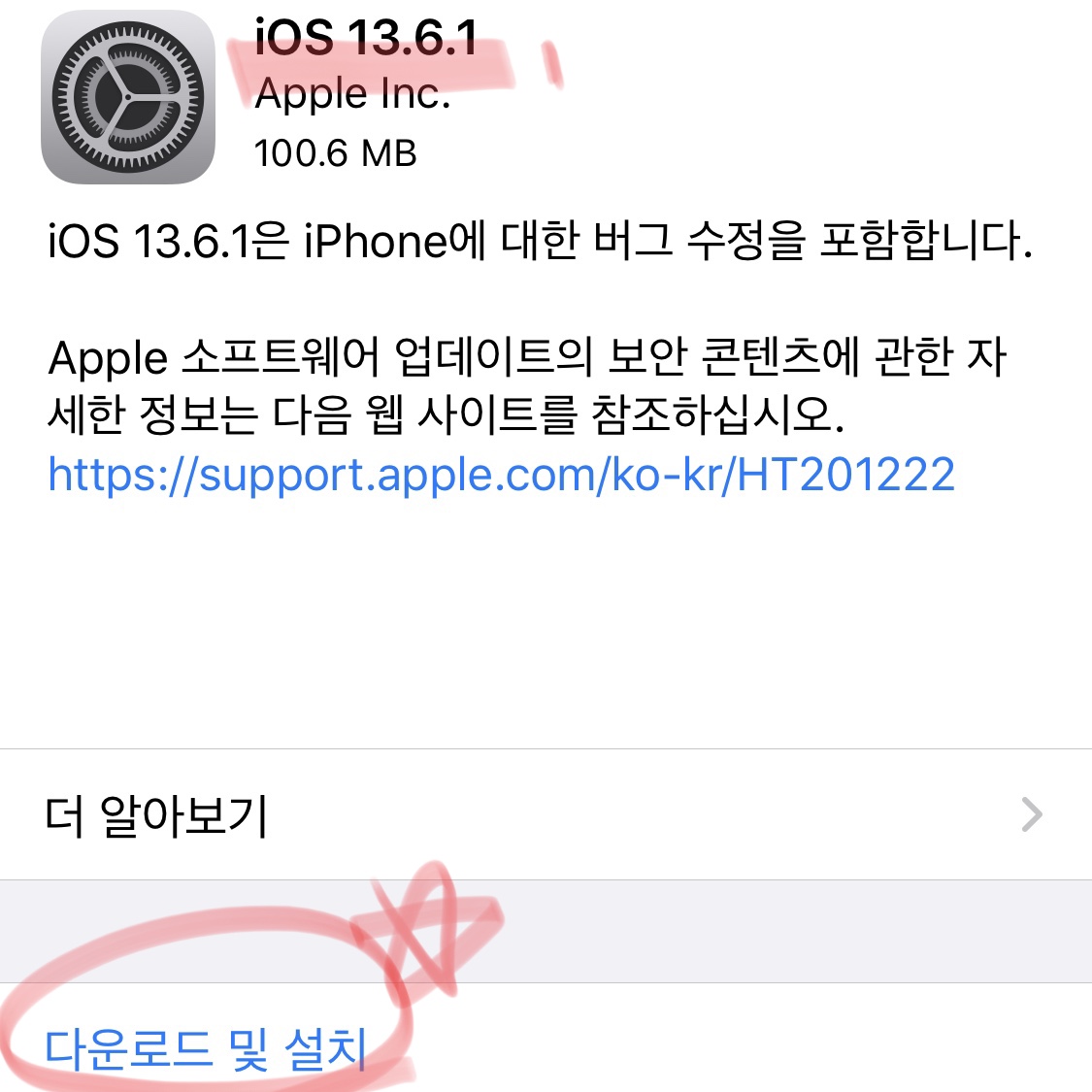 현재(8/27기준) 최신 iOS는 13.6.1 버전으로 만약 업데이트가 안되어 있으신 경우는 설정-일반-소프트웨어 업데이트 순으로 클릭하신 후 자신의 iOS 버전을 확인 하신 후 최신버전이 아니실 경우 나타나는 다운로드 및 설치 버튼을 누르시고 업데이트 하시면 됩니다. 단, 업데이트는 충전기가 연결된 상태이며 업데이트 파일이 다운로드 가능한 wifi 환경에서만 가능합니다.