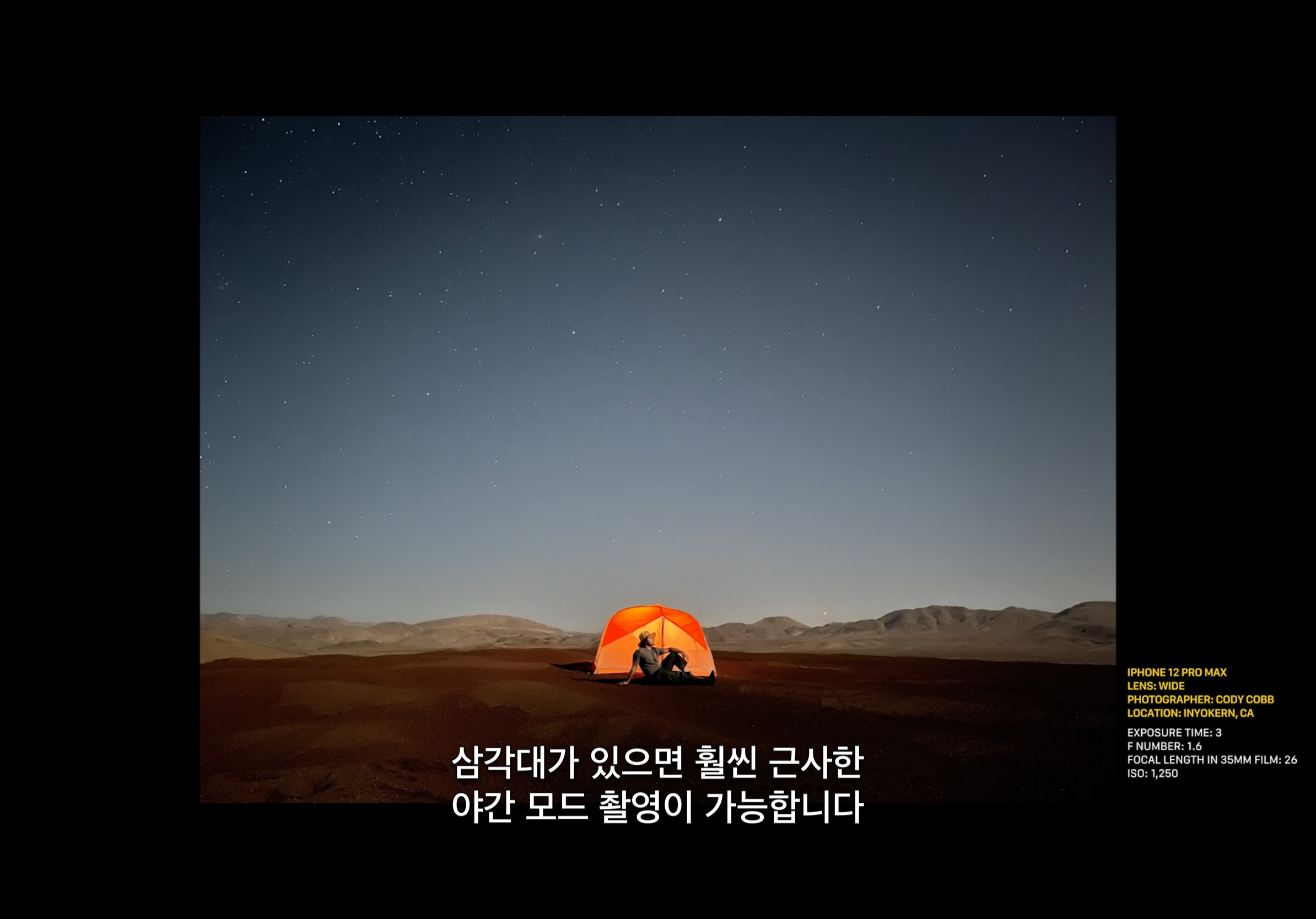 1️⃣ LIDAR 센서 탑재로 기본모델보다 카메라 성능이 업그레이드 되었습니다. 기본적으로 울트라와이드, 왕드 렌즈 외 망원 카메라가 추가로 탑재 되어 있습니다. 저조도에서도 야간인물모드 촬영이 가능합니다. 또한 Apple ProRAW를 지원하여 전문가 수준의 사진 퀄리티 및 편집이 가능합니다. 정말로 프로다운 기능을 탑재한것을 알 수 있습니다. (아이폰12, 미니는 미지원)