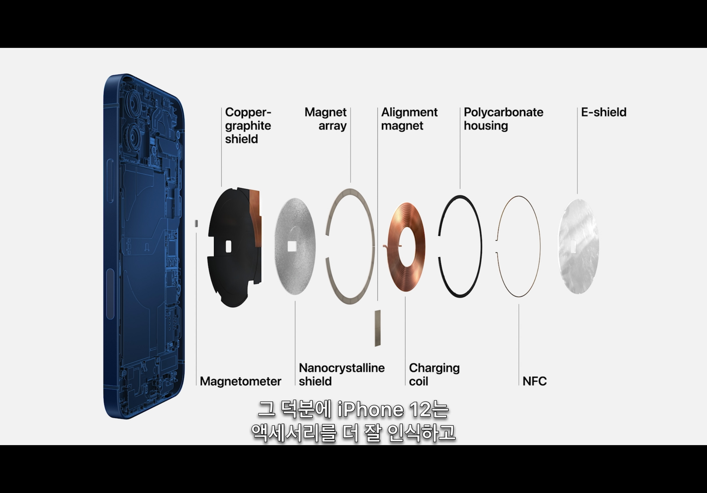 - MagSafe라는 충전 악세사리를 통해서 좀더 빠르게 충전이 가능하며, 이와 관련된 충전악세사리, 핸드폰 케이스가 동시에 출시 됩니다. 아이폰12에 내장된 자석을 통해서 악세사리 탈부착을 통해 무선 충전이 가능하며, 카드지갑과 같은 악세사리도 탈부착이 가능하게 되었습니다.