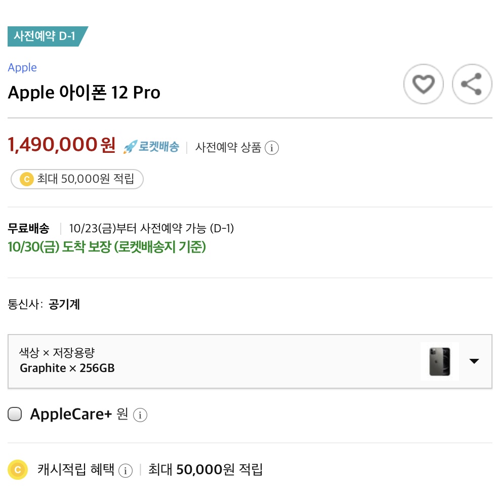 11번가: 11번가 판매페이지에서 10/23일 자정부터 예약판매 시작. 5대 카드사별 10%할인 쿠폰제공, 아이폰12 프로 전용 12% 할인쿠폰, T맴버쉽 할인, 최대 22개월 무이자 할부 혜택을 지원한다. 또한 구매자 대상 악세사리 증정 이벤트도 병행 진행.