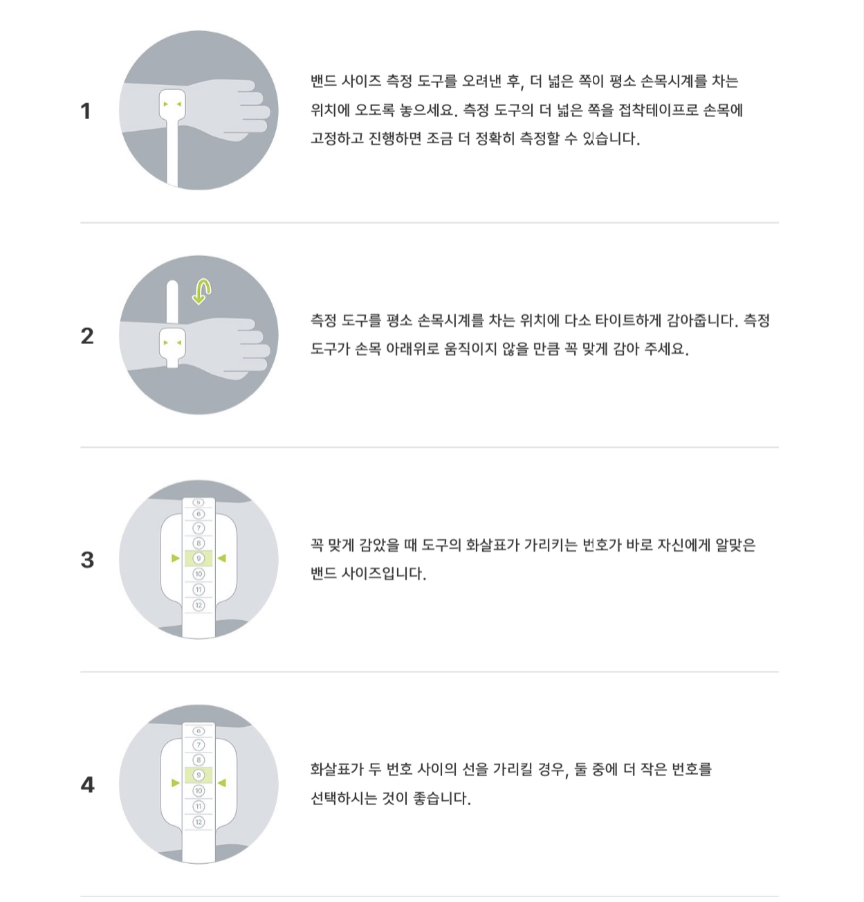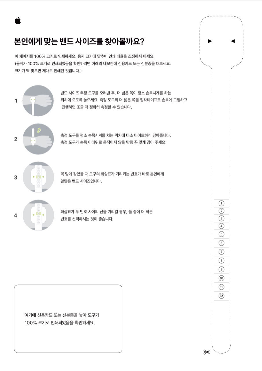 관련하여 애플에서는 공식홈페이지에서 다운로드 후 프린트 할 수 있는 측정 도안과 일반적으로 길이를 젤수 있는 줄자를 통해서 자신이 구매할 밴드의 사이즈를 확인 가능합니다. 신축성이 있는 밴드이다보니 측정시 나온 사이즈가 중간 수치인 경우 작은 사이즈로 구매를 추천하고 있습니다.