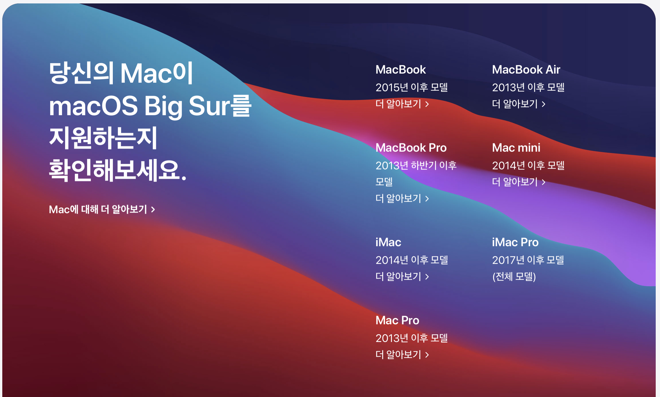 업데이트는 최근 발매되는 맥 시리즈에 대해서는 언제나 그렇듯 지원할 예정입니다. 이미 업데이트가 가능한 맥 시리즈에 대해서는 아래와 같이 공식 홈페이지를 통해서 안내하고 있으니 본인이 가지고 계신 맥이 해당되지 사전에 확인해보세요!